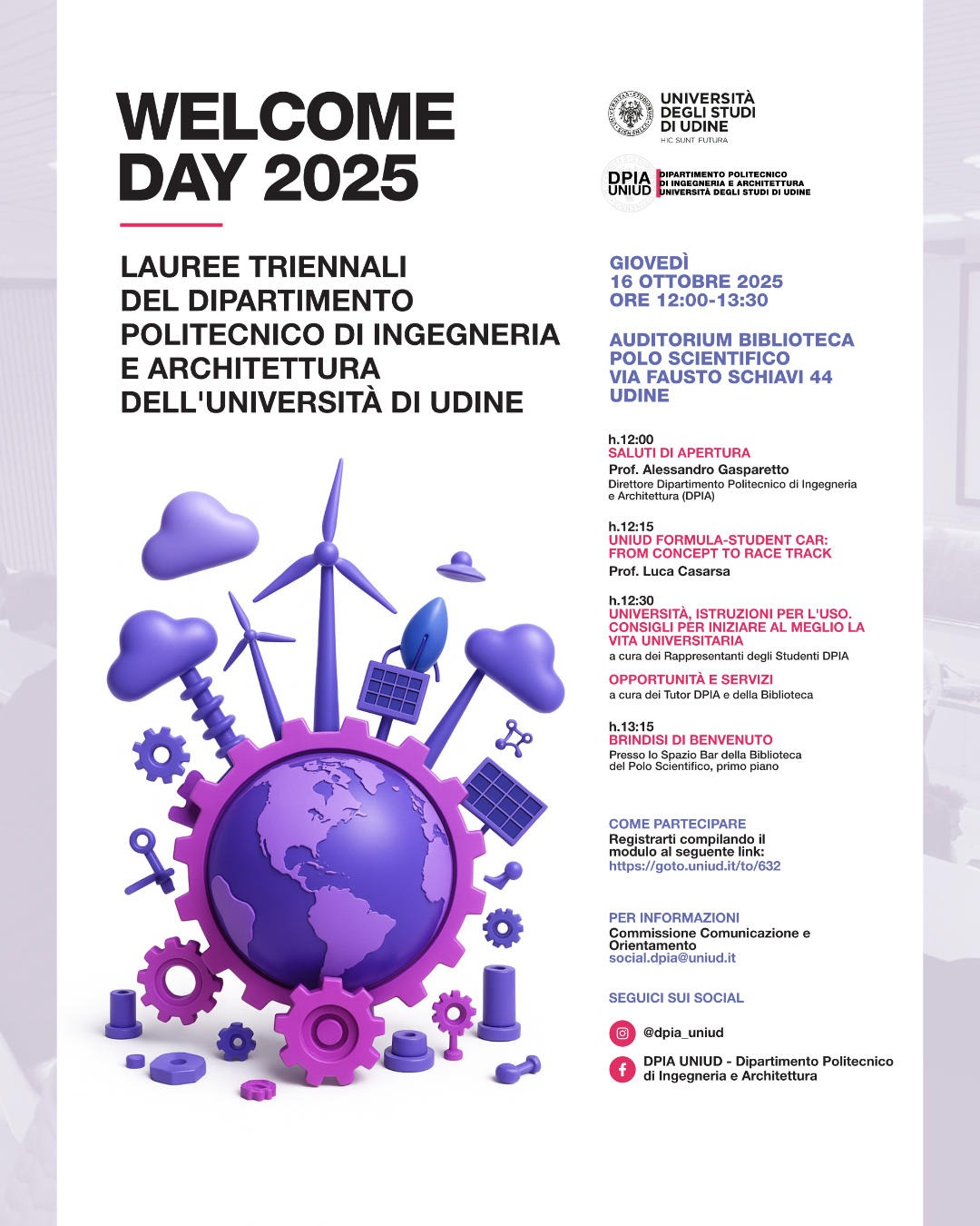 Il Dipartimento Politecnico di Ingegneria e Architettura dell'@universitadiudine invita i nuovi studenti iscritti al primo anno al Welcome Day che si terrà: giovedì 16 ottobre 2025, dalle 12:00 alle 13:30 presso l’Auditorium della Biblioteca del Polo Scientifico Rizzi (via Fausto Schiavi 44, Udine).